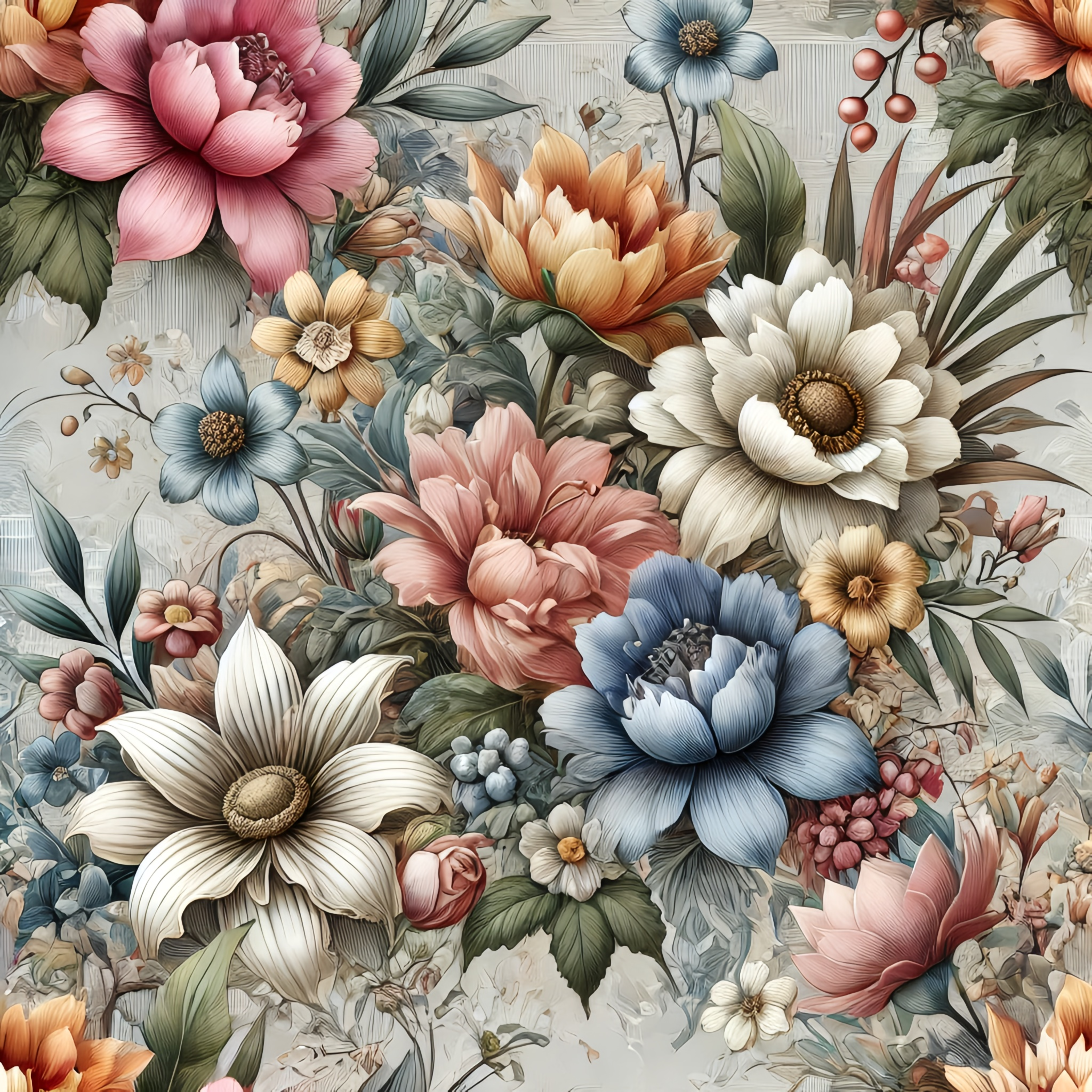 This high-resolution vintage floral fabric design features hand-drawn, intricately detailed flowers in a soft, elegant color palette of blush pink, ivory, dusty blue, and gold. Perfect for digital textile printing, this seamless botanical illustration brings a timeless charm ideal for sarees, dresses, curtains, cushion covers, and more. The floral elements are layered over a subtle textured background to enhance depth and sophistication, making it a premium choice for fabric manufacturers and designers.