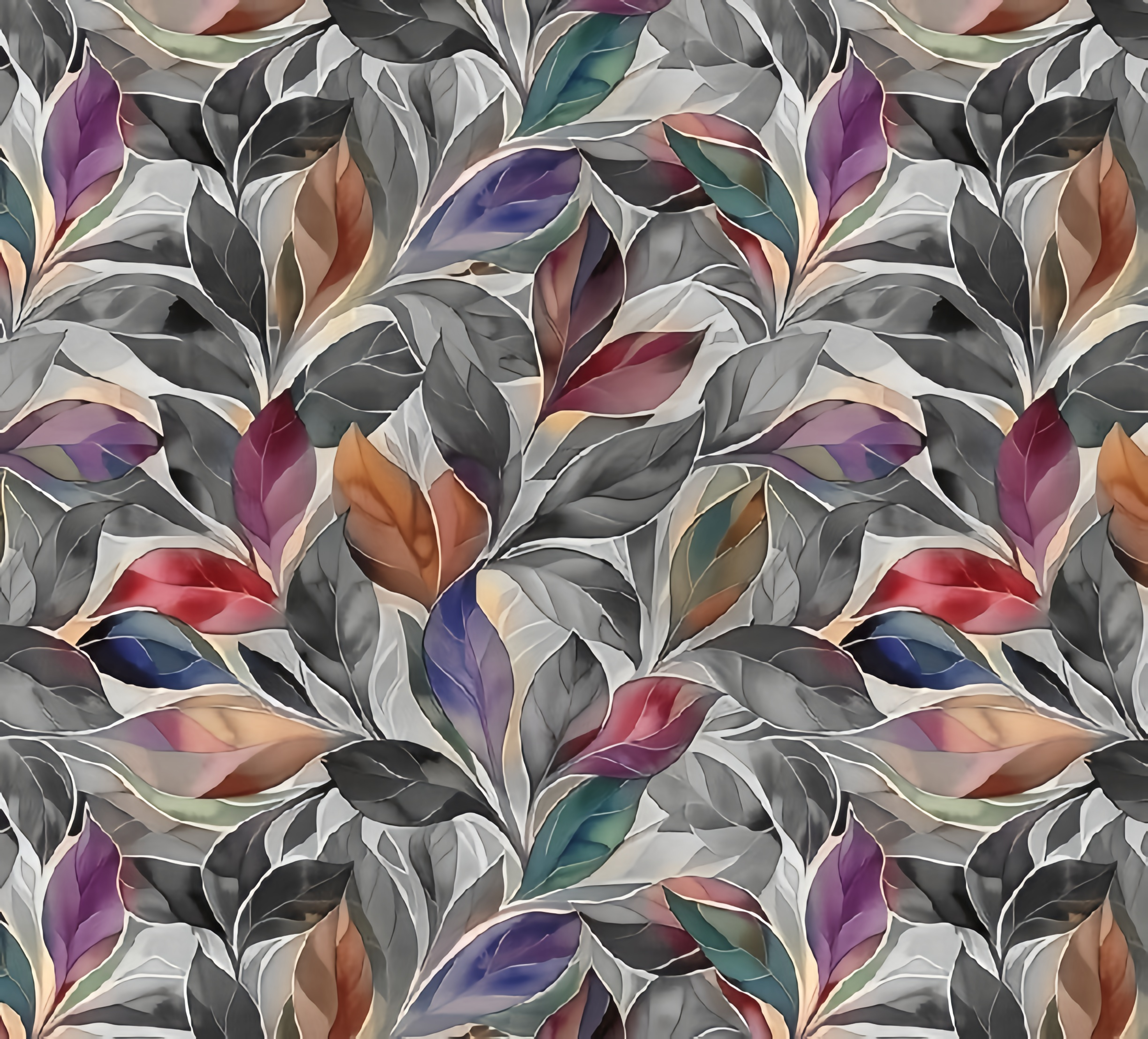 Seamless Colorful Leaves Pattern with Abstract Gray Background all-over pattern beautifully showcases vibrant, colorful leaves set against a soft abstract gray background. The contrast between the lively leaf colors and the subtle gray tones creates a balanced and visually striking design.