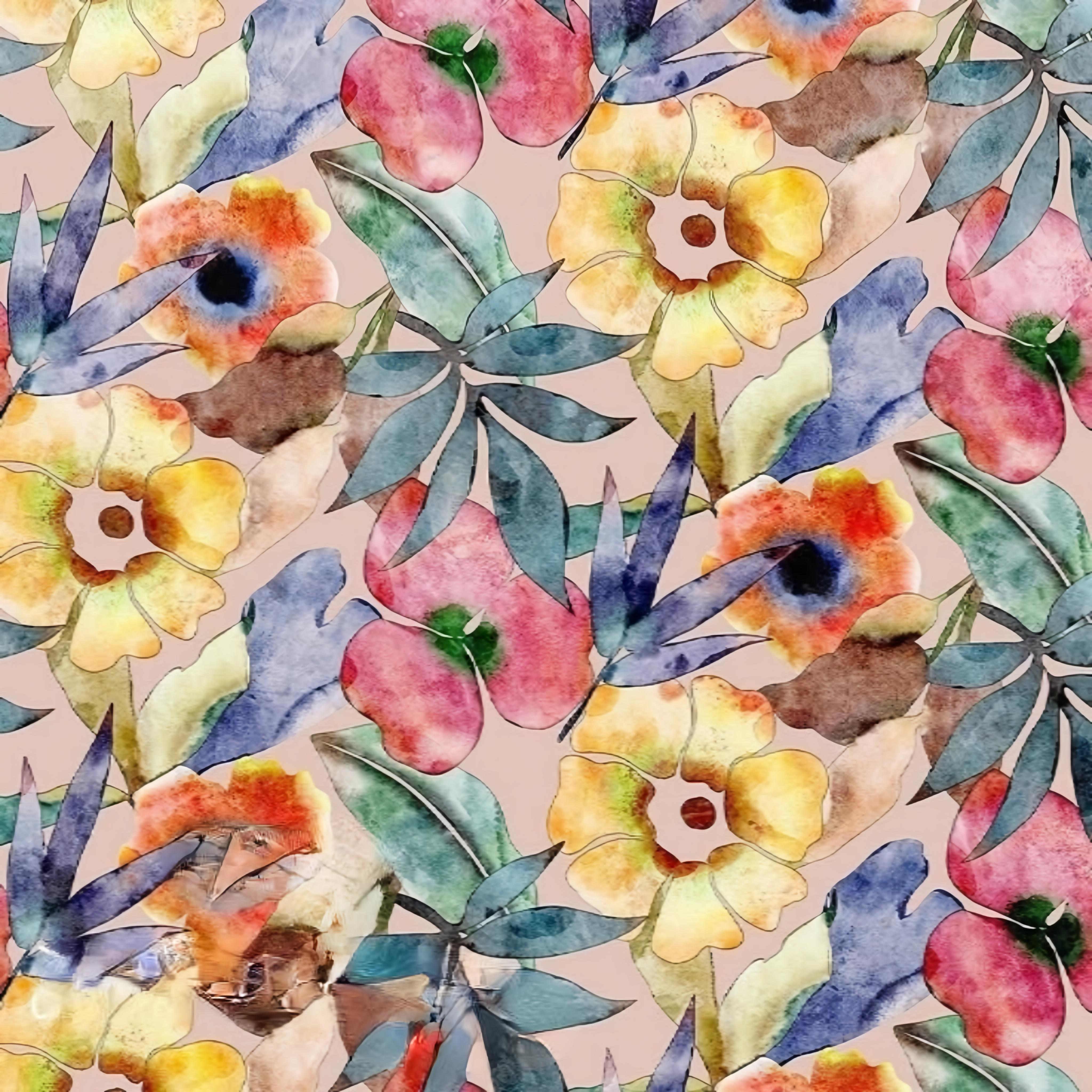 Brighten your designs with this stunning seamless floral pattern, hand-painted in watercolor with vibrant hues of yellow, red, orange, and blue. Featuring lush tropical leaves and soft floral details on a warm beige background, this high-resolution PNG design is perfect for fabric prints, wallpapers, digital projects, and more. Its seamless structure and transparent background make it easy to apply across large surfaces or repeated patterns.